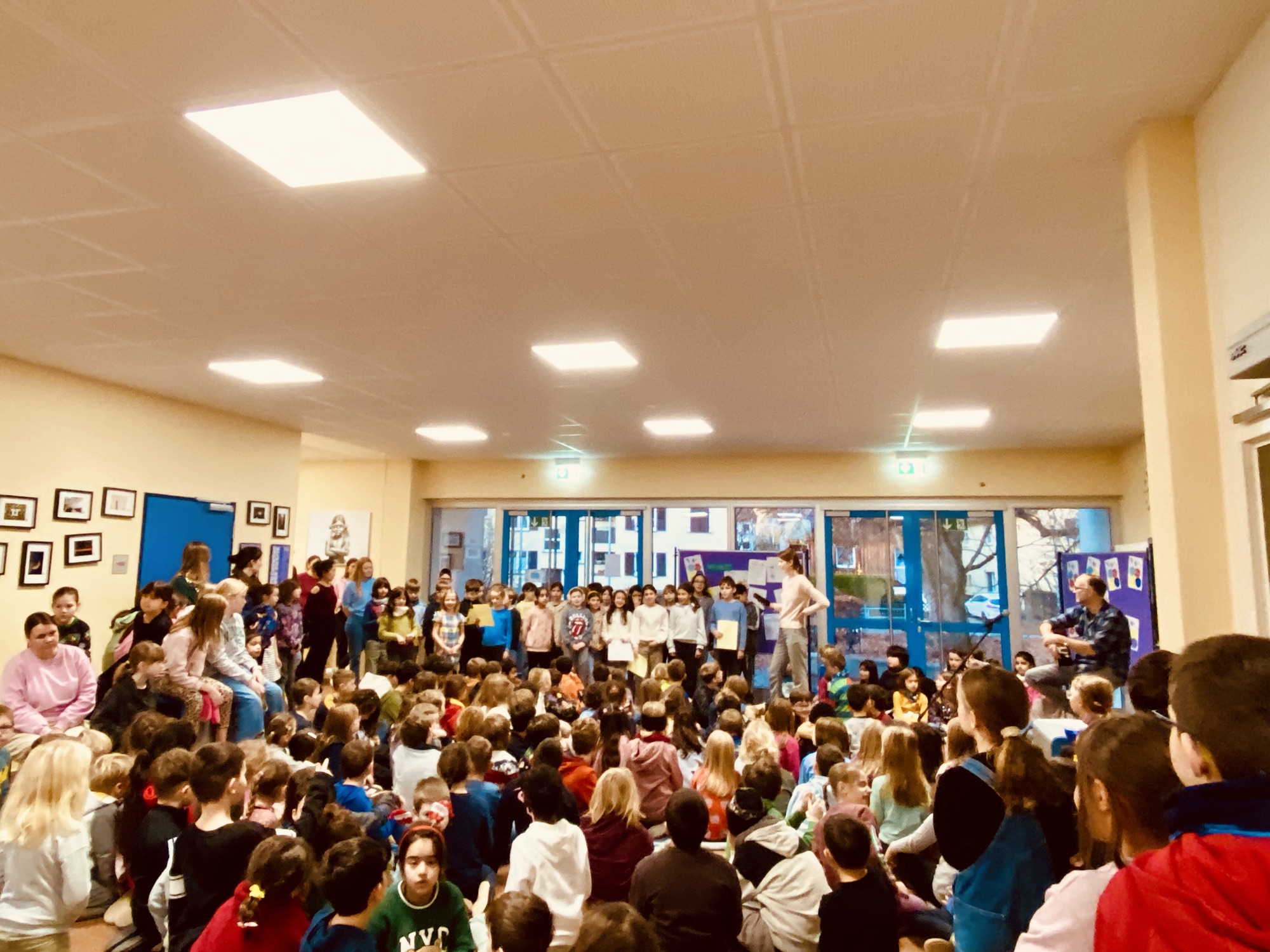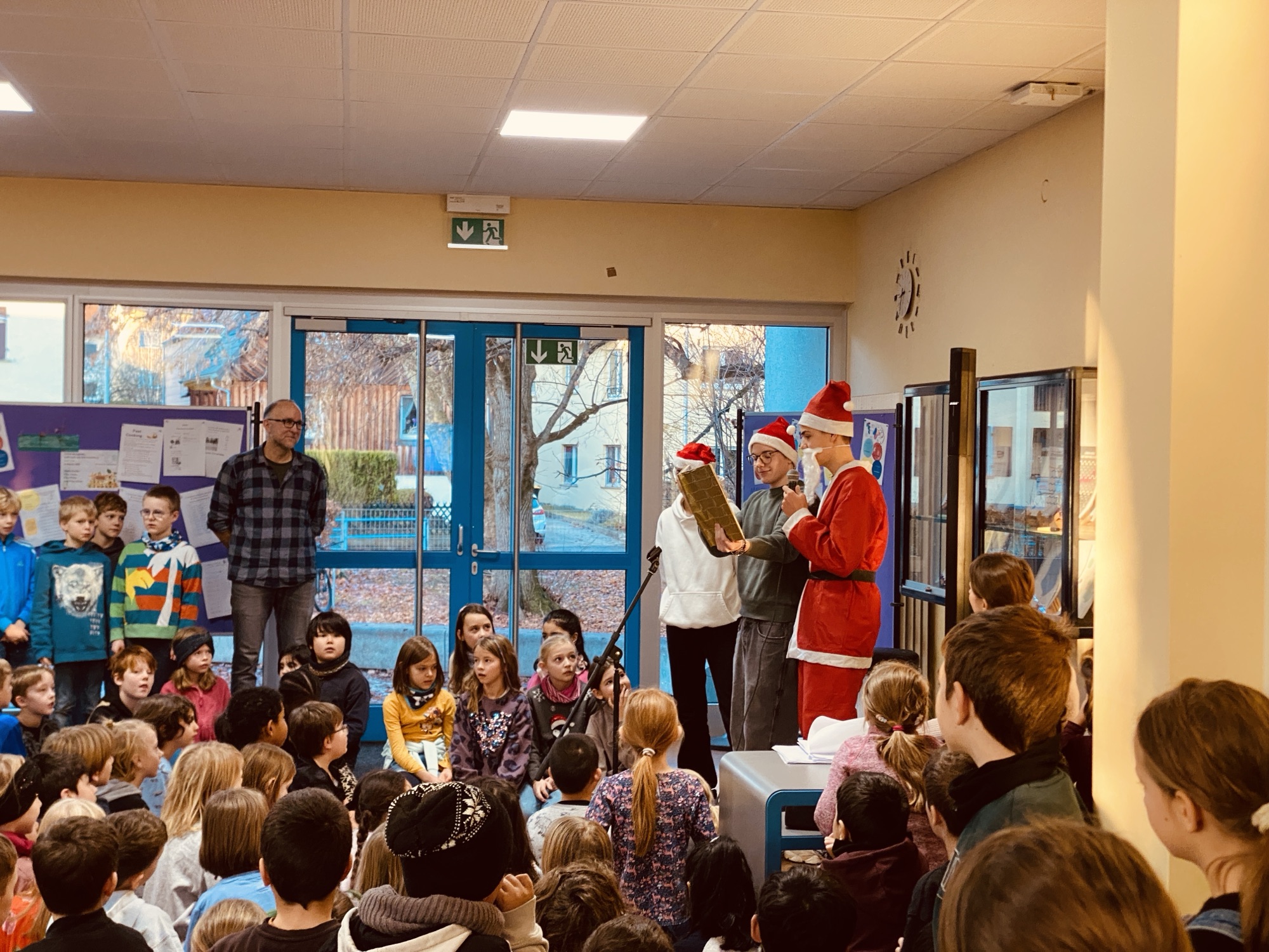 Im Dezember trifft sich unsere Grundschule immer mittwochs um 8 Uhr in der Aula zum gemeinsamen Adventssingen. Heute war die Stimmung besonders festlich: Der Nikolaus kam zu Besuch – und auch Schuhhund Ella war mit dabei!